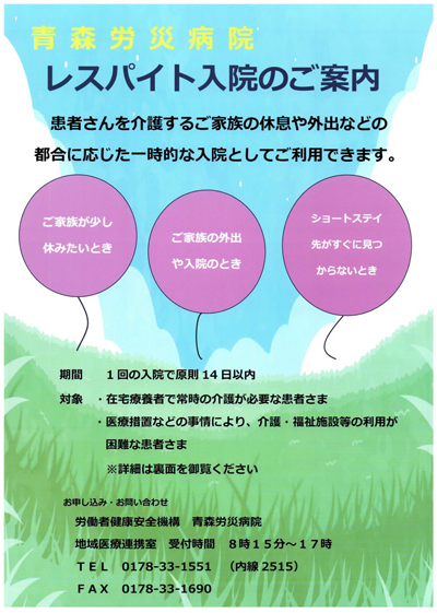 | 電 話 | 0178-33-1551(病院代表)(内線2515) ※「レスパイト相談」とお伝えください。 |